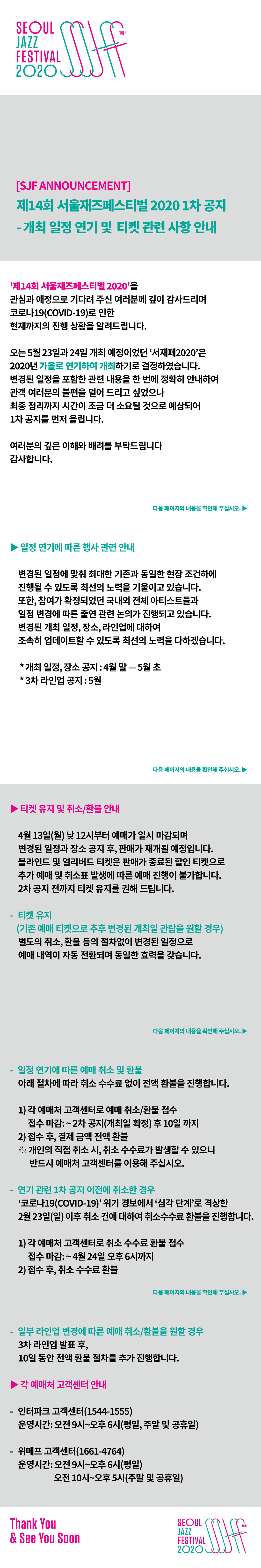 14회 서울재즈페스티벌 2020 공지 1 - 개최 일정 연기 및 티켓 관련 안내